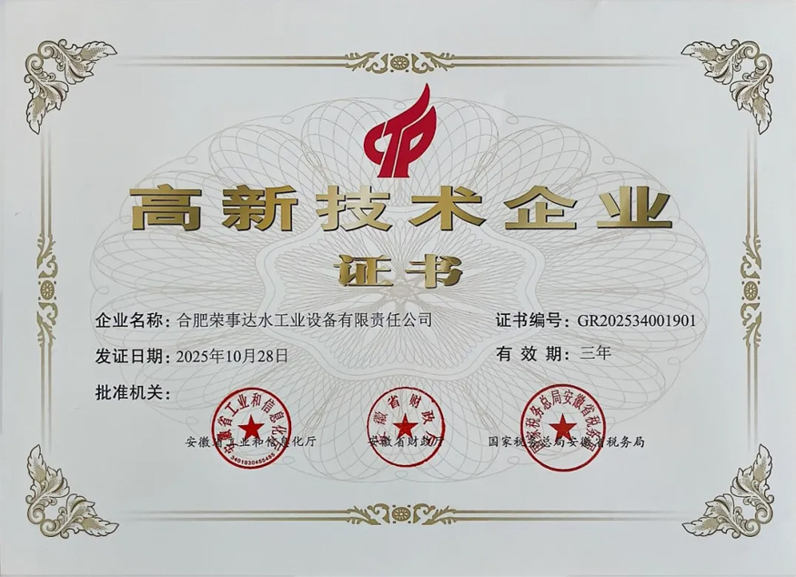 合肥榮事達水工業(yè)設備有限責任公司通過高新技術(shù)企業(yè)認定,榮獲由...