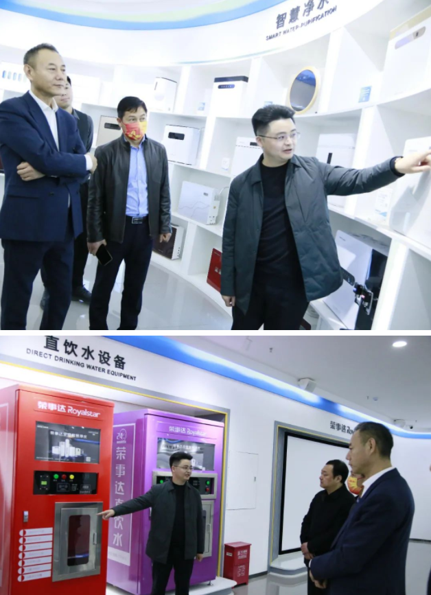 領導一行先后參觀了榮事達商用設備生產車間、榮事達智能家用凈水生產車間和智慧水世界展廳。了解榮事達企業綜合實力及十大水處理系統具體發展狀況。