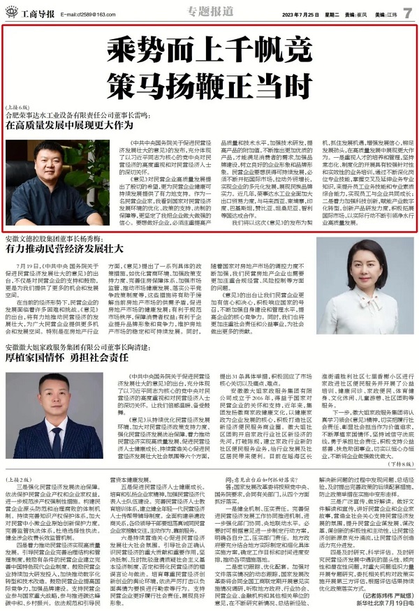 近日,《工商導(dǎo)報》報道了合肥榮事達(dá)水工業(yè)設(shè)備有限責(zé)任公司董事長雷鳴關(guān)于《中共中央國務(wù)院關(guān)于促進(jìn)民營經(jīng)濟(jì)發(fā)展壯大的意見》感悟。